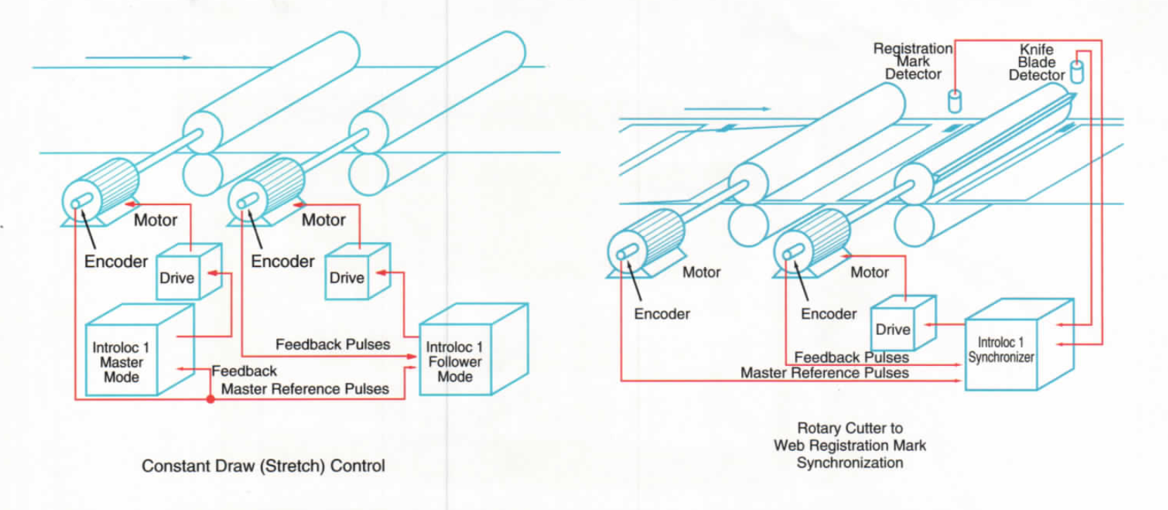 The Introloc 1 can also accept positional signals from a proximity switch or marker pulse of an encoder, for “keyway to keyway”, or product synchronization and automatic position match, resulting in a low cost electronic line shaft or gearbox. The Introloc 1 can constantly monitor master and slave position and compensate for any product inconsistency in spacing. In situations where the follower drive is stopped and restarted with the master operating at line speed, the Introloc 1 can start the motor and reach synch speed smoothly.